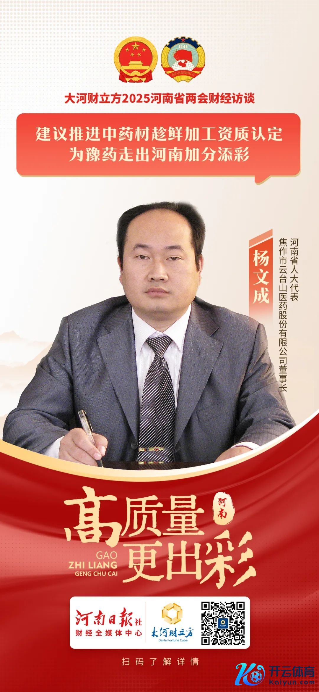 本年河南省两会时期,省东说念主大代表、焦作市云台山医药股份有限公司(以下简称云台山医药)董事长杨文成给与大河财立方记者采访,他建议,河南揣摸部门应积极鞭策企业中药材趁鲜加工天赋认定,汲引豫药品牌竞争力,为豫药走出河南加分添彩。