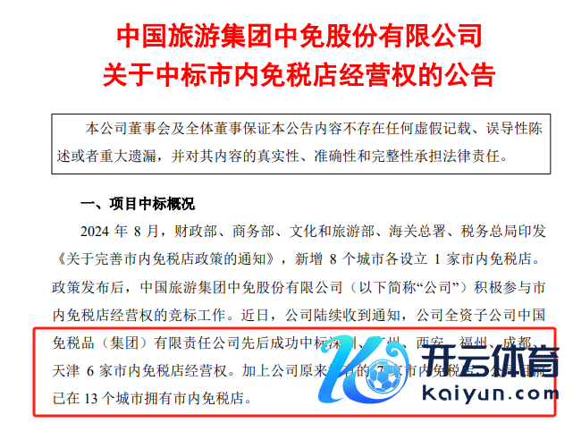 中免集团官网信息走漏,2024年12月底,中旅免税接踵成效中标深圳、广州、西安、福州4家市内免税店神气。2025年1月9日和13日,中免集团又分袂中标成齐和天津市内免税店神气。